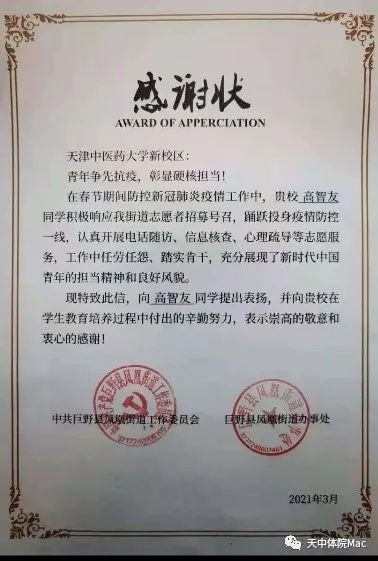 在返校后,我们收到了一封来自中共巨野县凤凰街道工作委员会的感谢状。“青年争先抗疫,彰显硬核担当。”感谢状中如此写到。高智友同学在志愿服务中的任劳任怨,踏实肯干,敢于奉献的精神感动了体育健康学院的每一个同学,也激励着同学们自告奋勇参加各种志愿活动。