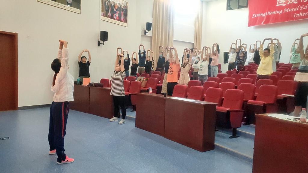 讲座伊始,周倩老师结合“健康中国”大战略、中医药大学特色专业阐释了“治未病”理念,由此引出“医体融合”大健康理念下科学健身的重要性,并向全体新入职教师讲授了健身气功、八段锦等传统体育项目对促进人们身心健康发展的重要作用。讲练结合,周倩老师还现场带领大家习练传统体育疗法并阐释每个动作要领及所蕴含的健康养生理念,并鼓励大家在工作之余充分利用碎片化时间锻炼身体,增强体魄。