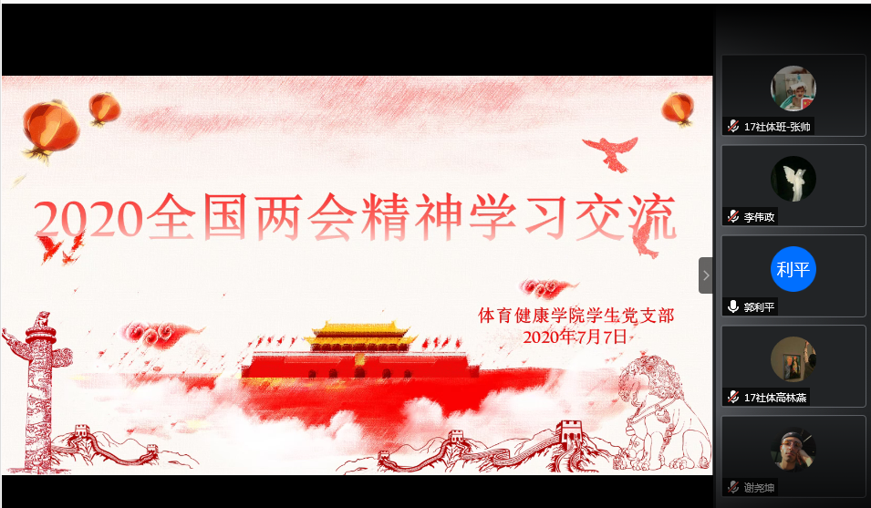 为进一步深入学习贯彻习近平总书记重要讲话精神和全国两会精神,我院学生党支部于7月7日下午3时通过腾讯会议在线上举办“2020全国两会精神交流会”。参加此次会议的有天津中医药大学副校长郭利平、体育健康学院党总支书记李超、组织员罗凌云、辅导员成甜以及学生党支部全体成员、“Ace”训练营全体成员。会议由党支部书记成甜主持。