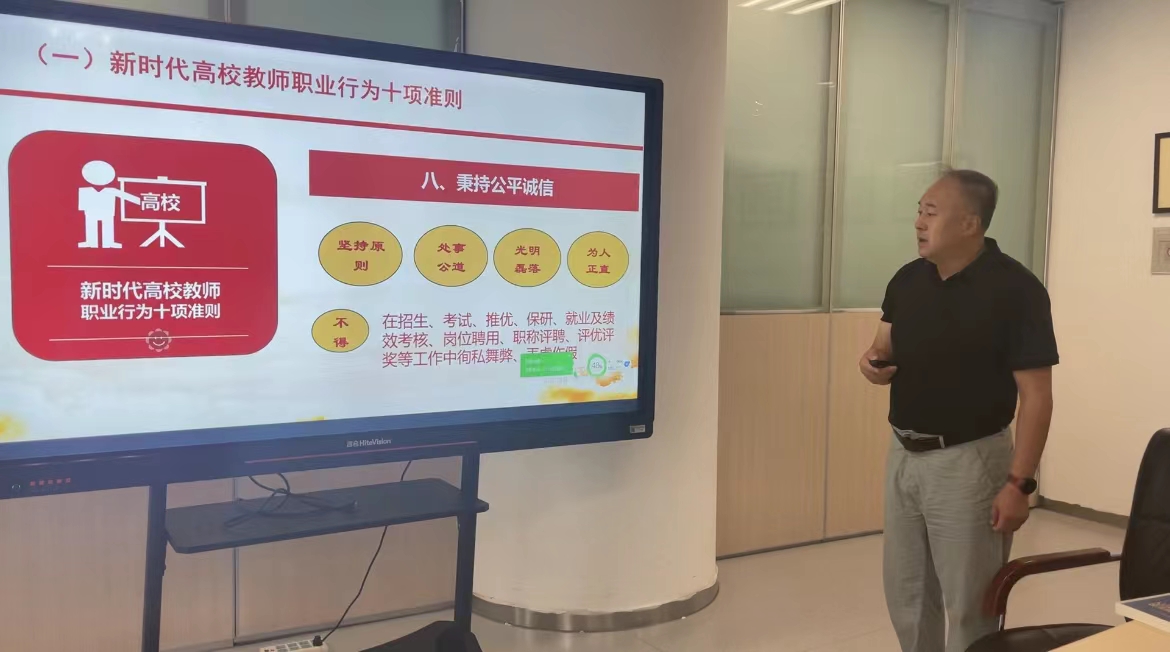 会上,首先由李超书记讲授题为“坚守底线、不越红线”的党风廉政暨师德师风教育专题党课。李超书记从思想境界上强化“四个意识”、道德修养上做到“五慎”、实际行动把好“三关”三个方面,结合具体案例,强调加强党风廉政建设的重要性及具体要求,一是要把作风建设推向深入,营造健康向上的发展环境;二是要把纪律建设挺在前面,用严明的纪律管党治党;三是要把制度建设贯穿始终,强化制度的约束力和执行力。告诫全体教职工务必有信念、不动摇,有敬畏、知行止,有分寸、戒贪欲,有原则、正家风。随后,重点解读了《新时代高校教师职业行为十项准则》和《教育部关于高校教师师德失范行为处理的指导意见》,强调,作为高校教师,必须以更高的政治站位,更好的担当精神,更高的标准要求,坚守为党育人、为国育才的初心,不断强师德、正师风,为培养德智体美劳全面发展的社会主义建设者和接班人作出新的更大贡献。