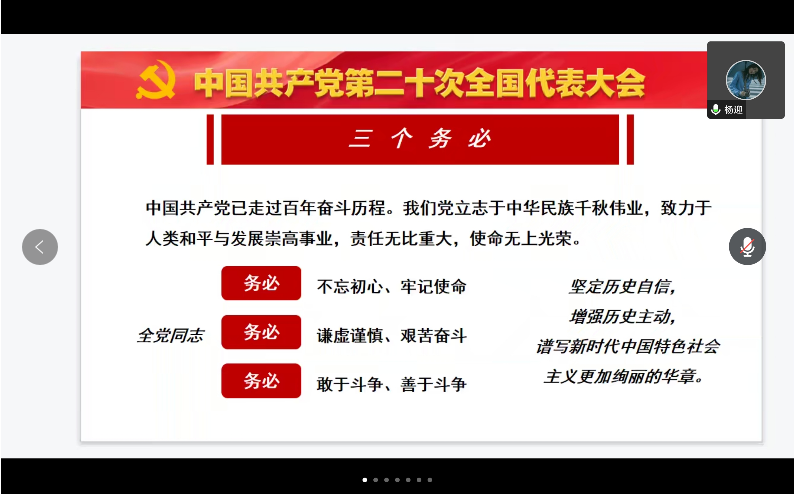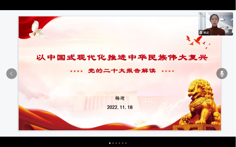 为进一步在学生党员群体中深入学习宣传贯彻习近平新时代中国特色社会主义思想和党的二十大精神,切实把全体学生党员的思想和行动统一到党的二十大精神上来,落实立德树人根本任务,培养堪当民族复兴重任的时代新人,11月18日下午,我院邀请了马克思主义学院杨迎老师采取线上授课的形式就“党的二十大报告解读”进行了专题宣讲,学院学生党支部书记周璇、学院组织员罗凌云、全体学生党员、入党积极分子共计50余人参加了本次宣讲会,宣讲会由周璇老师主持。