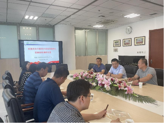 2023年6月14日,河北中医药大学体育教学部李维华主任、校园规划处刘忠翔副处长等一行人来我校调研交流。我校教务处处长张志国、体育健康学院党总支书记兼院长李超、副院长魏勇健等参加本次调研交流。